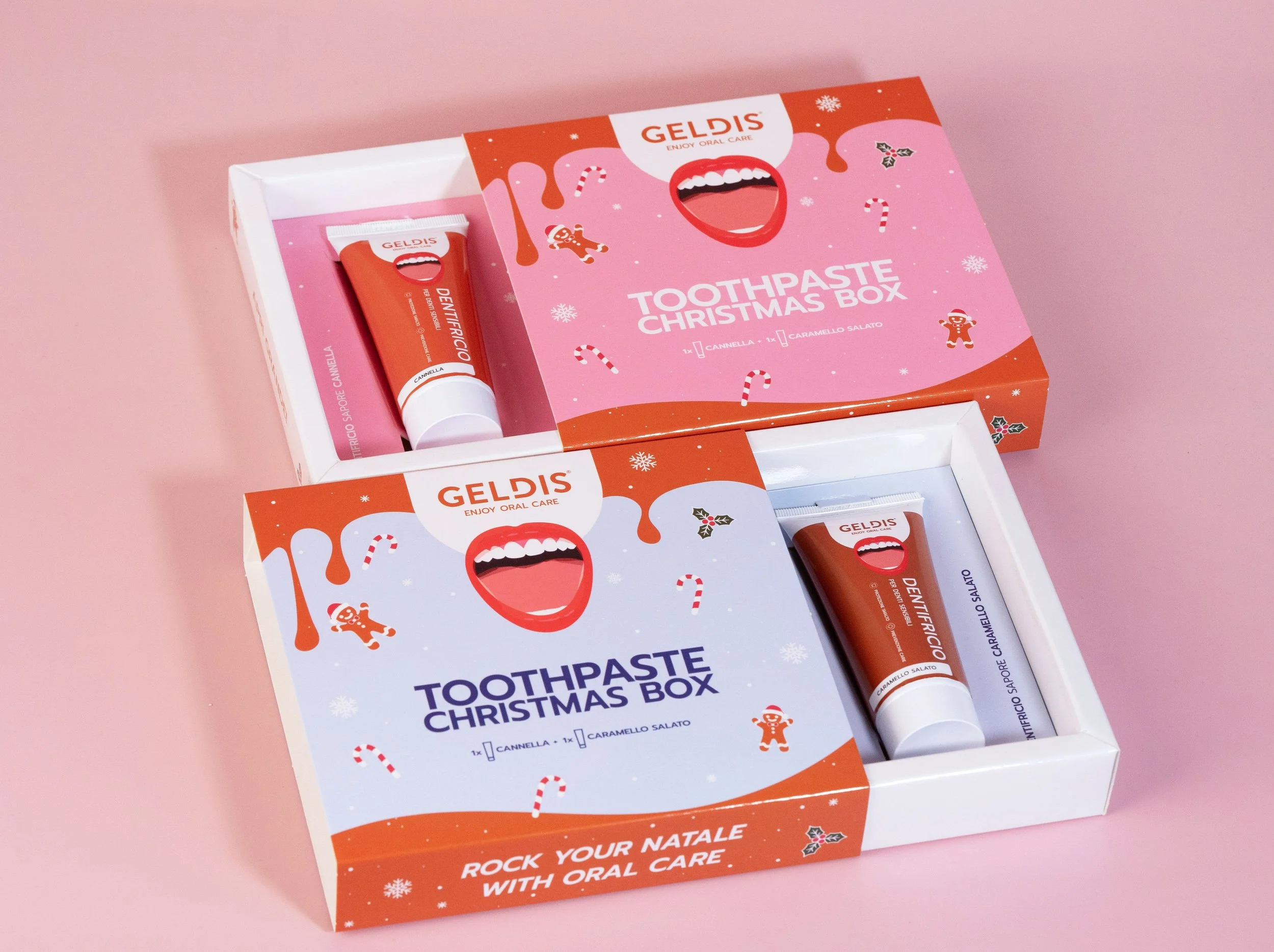 Limited edition natalizia composta da due dentifrici in formato ridotto, pensata per dentisti che desiderano proporre un prodotto festivo e decorativo all’interno dello studio. Il packaging, impilabile, crea un pattern di frasi diverse che richiama immediatamente l’atmosfera delle feste ed è adatto anche alla vendita in farmacia, in linea con i linguaggi espositivi dei cosmetici.