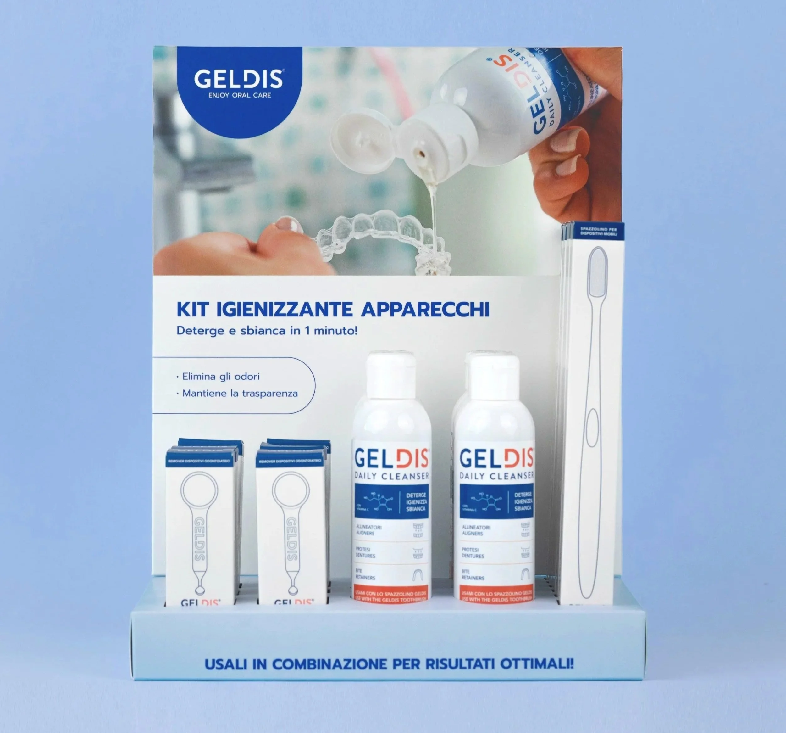 Il progetto include espositori da banco per kit ortodontici, dentifricio, scovolini e filo interdentale, oltre a un espositore da terra per il collutorio alla clorexidina.